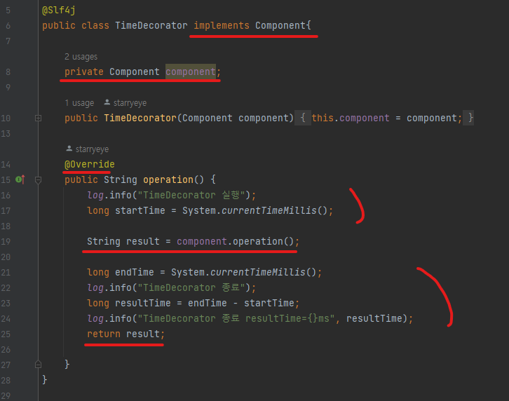TimeDecorator와 동일하게 component를 주입받아 가지고 있으며..