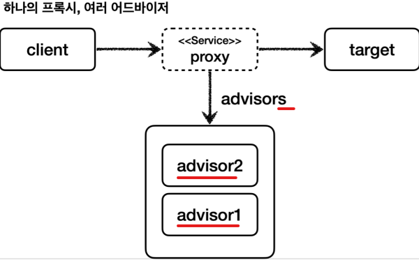 -> 이는.. 하나의 프록시에 하나의 어드바이저로 프록시 자체를 여러개 적용시키는 방법보다 효율적이다.