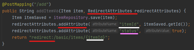 RedirectAttributes 객체에 넣은 key가 return에 존재한다면 그 자리에 그대로 들어간다.