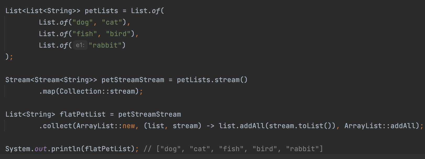 이해를 돕기 위해 flatMap() 을 사용하지 않고 map() 메서드만을 이용해 동일한 결과를 만든 코드이다.