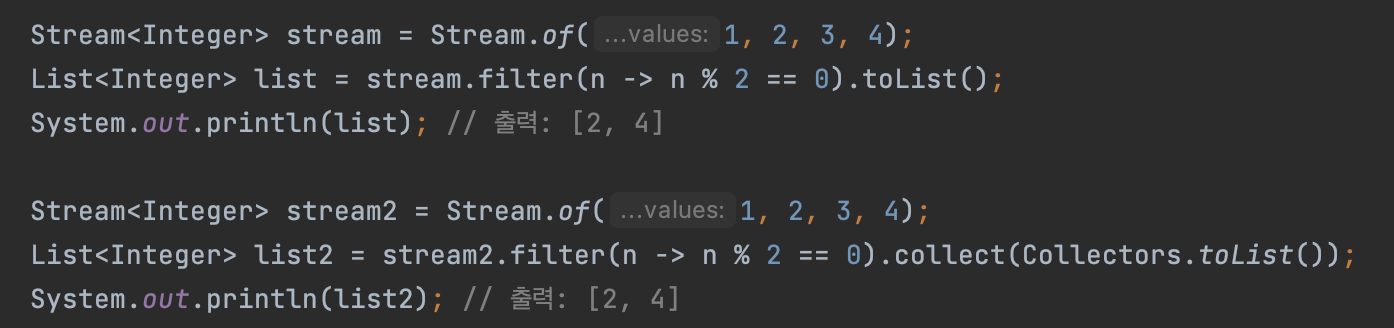 Java 16 이전에는 collect(Collectors.toList()) 를 사용했지만, 좀더 간결하게 표현 가능해졌다.