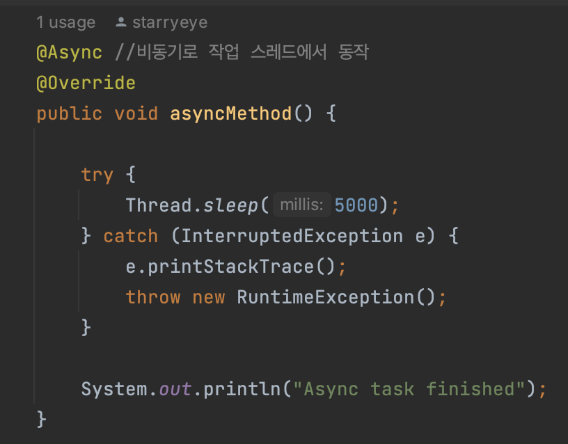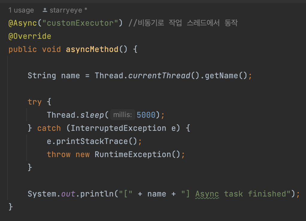 @Async 어노테이션이 적용된 asyncMethod 메서드는 별도의 스레드에서 해당 메서드가 실행될 것이다.