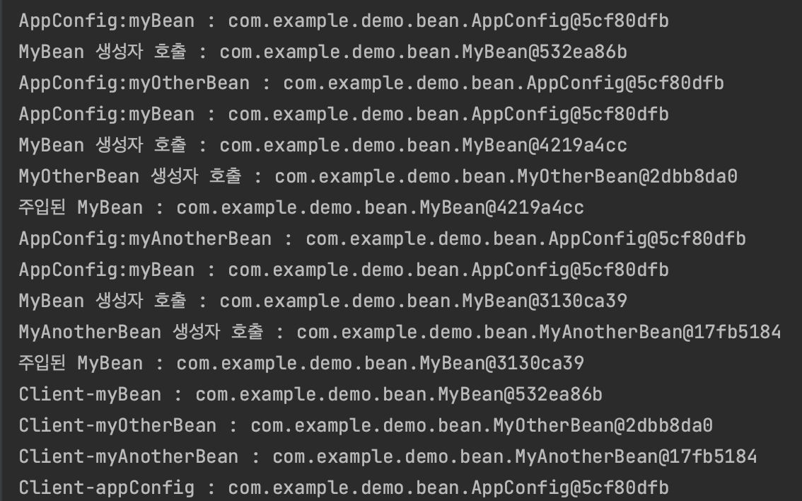 @Configuration public class AppConfig { @Bean public MyBean myBean() { return new MyBean(); } @Bean public MyOtherBean myOtherBean() { return new MyOtherBean(myBean()); } @Bean public MyAnotherBean myAnotherBean() { return new MyAnotherBean(myBean()); } }위와 같은 코드가 있다.