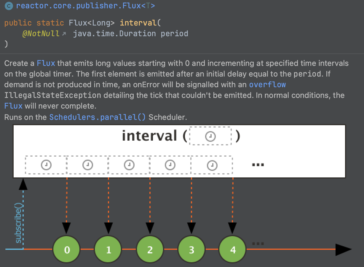 Parallel Scheduler 에 의해 특정 Duration 만큼 씩 기다렸다가 element 를 downstream 으로 전달하게 된다.