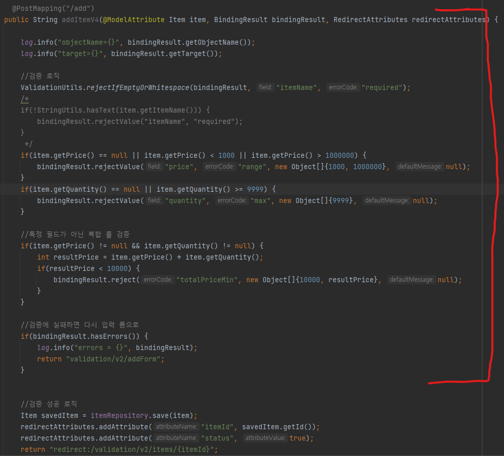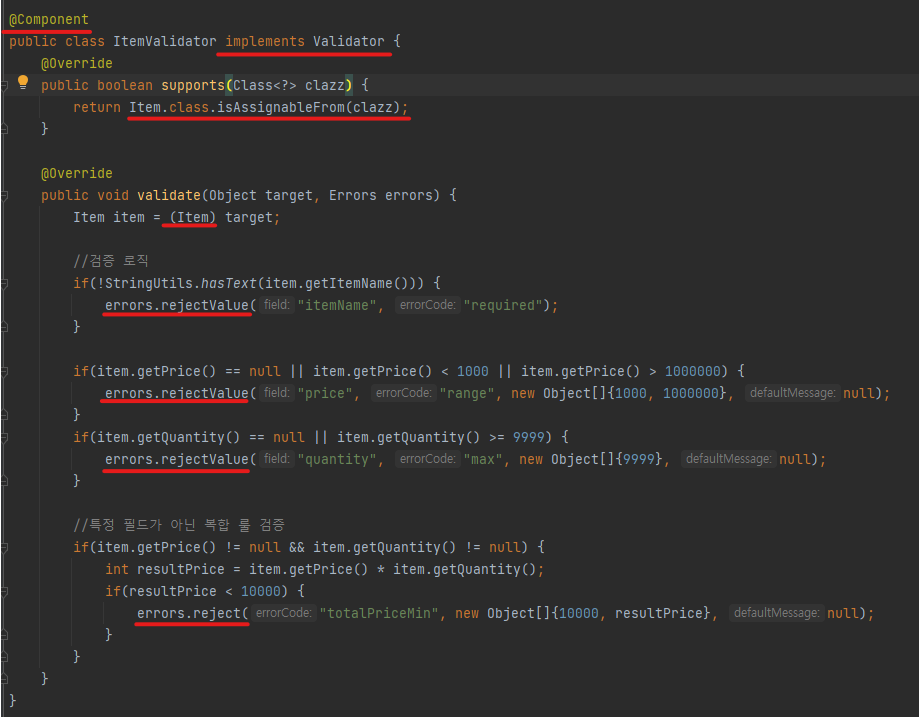 validate : 컨트롤러에 있었던 검증로직을 다 들고 왔다. BindingResult 의 부모인 Errors에 reject, rejectValue 메서드로 개발자 검증 에러를 넣을 수 있도록 해준다.