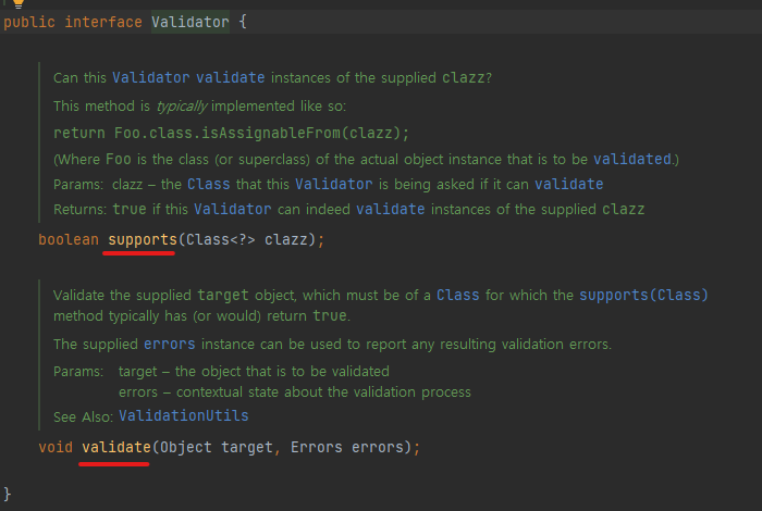Validator 인터페이스 supports : 파라미터로 들어오는 clazz가 개발자가 의도한 검증할 클래스 타입인지 확인하는 메서드