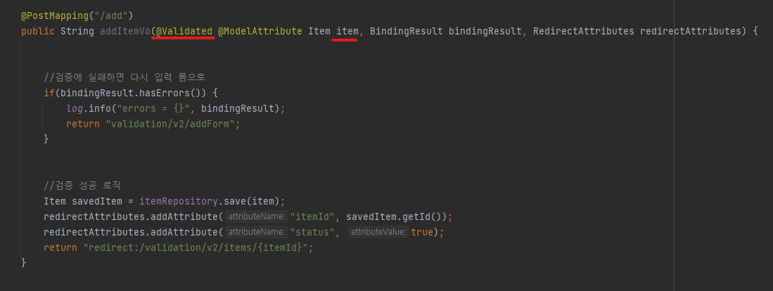 위와 같이, 검증할 대상 파라미터 앞에 @Validated(스프링지원) 또는 @Valid(자바표준)을 적용하면