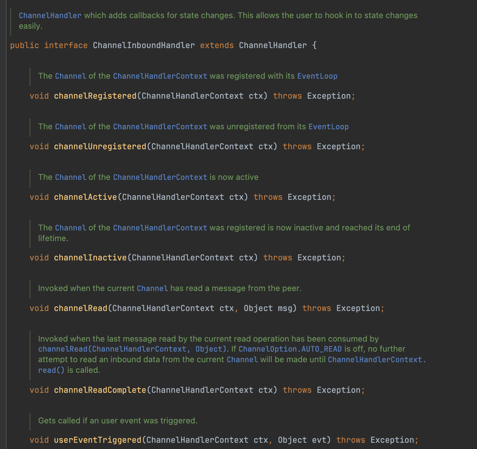 위 그림은 ChannelInboundHandler 인터페이스의 일부이다.