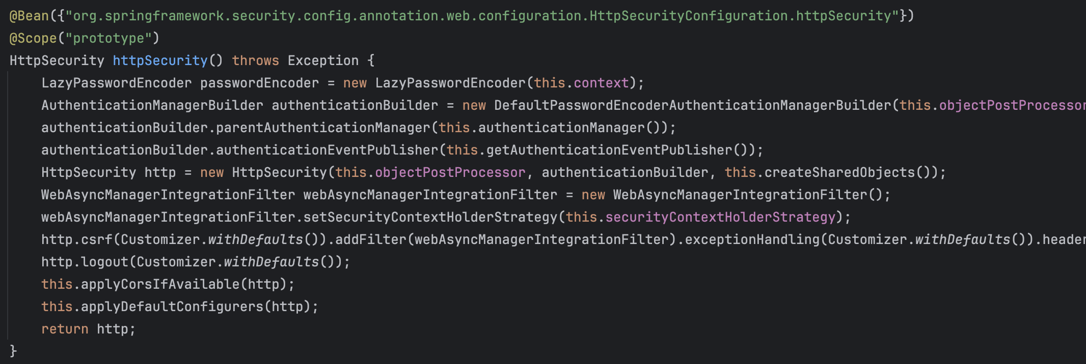 위는 HttpSecurityConfiguration 클래스에 존재하는 HttpSecurity 빈 등록 코드이다.