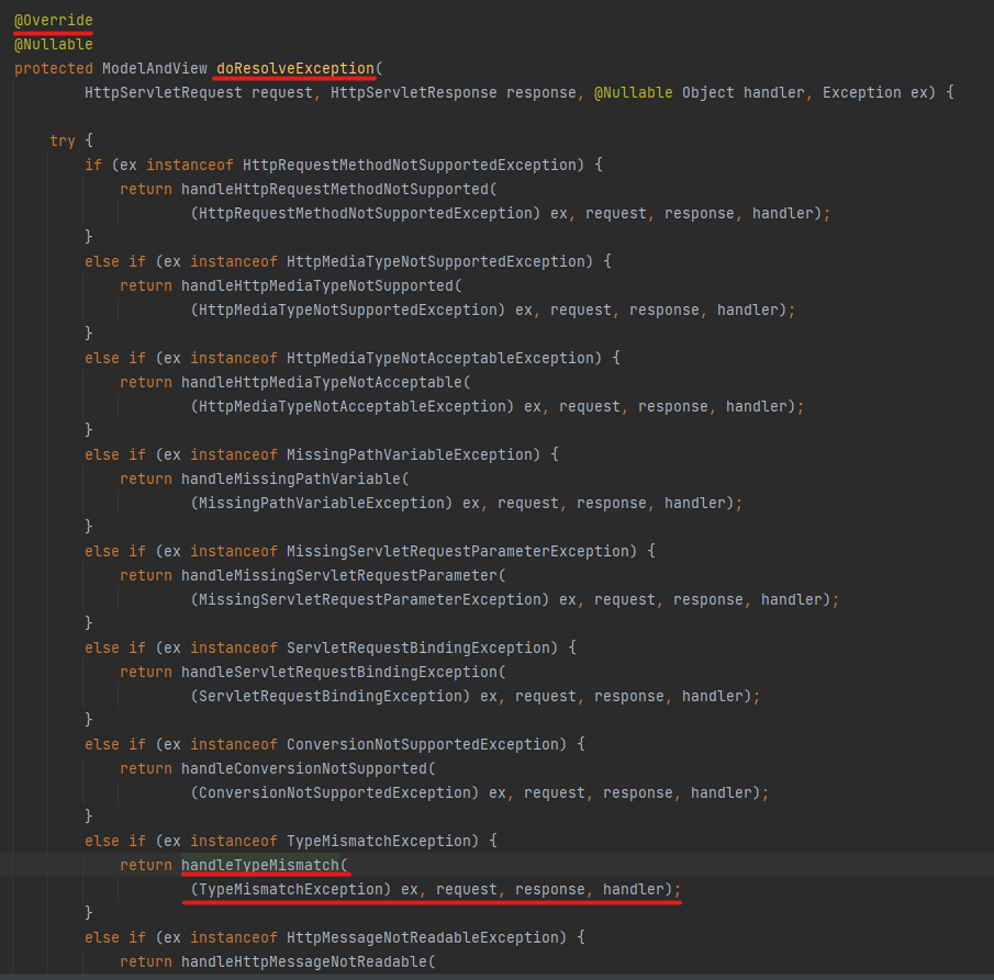 DefaultHandlerExceptionResolver의 코드를 보며 내부 동작에 대해 알아보자.