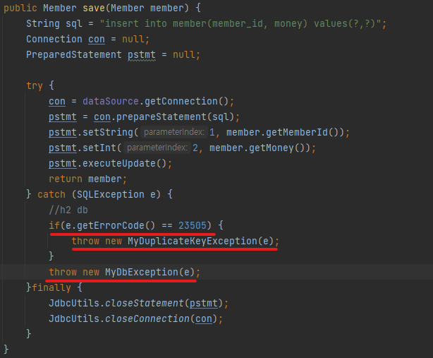 중복 key의 경우 MyDuplicateKeyException 예외로 변환하여 던지고 있다.
